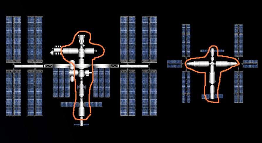 Even though the CSS is smaller, it’s super-efficient and packed with advanced technology. Here is an indicator: pressurized volume (outlined in orange in the above image). It refers to the size of the space that can actually be used on the space station.