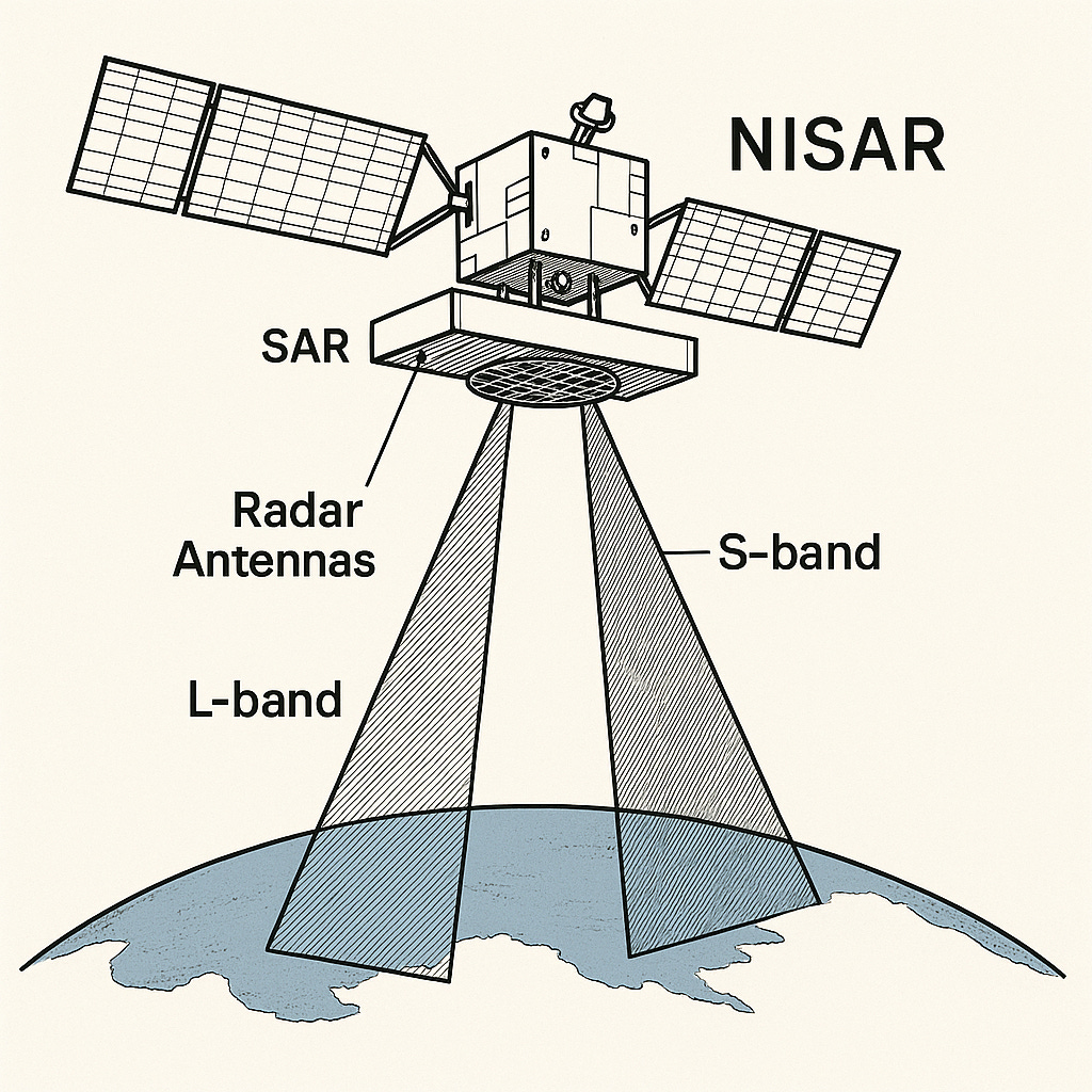 NISAR's most distinctive feature is its dual-band Synthetic Aperture Radar (SAR) system, making it the first satellite to employ both L-band and S-band radars simultaneously. This innovative approach provides complementary capabilities: