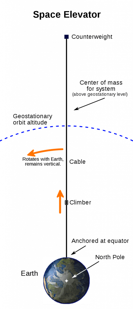 Another famous concept — its principal element is a long cable or tether being attached to the surface and extending into space above the geosynchronous orbit. The upper end of the tether's centrifugal force, which opposes gravity as the globe rotates, keeps the rope taut. After then, vehicles can ascend the tether and enter orbit without using rocket propulsion.