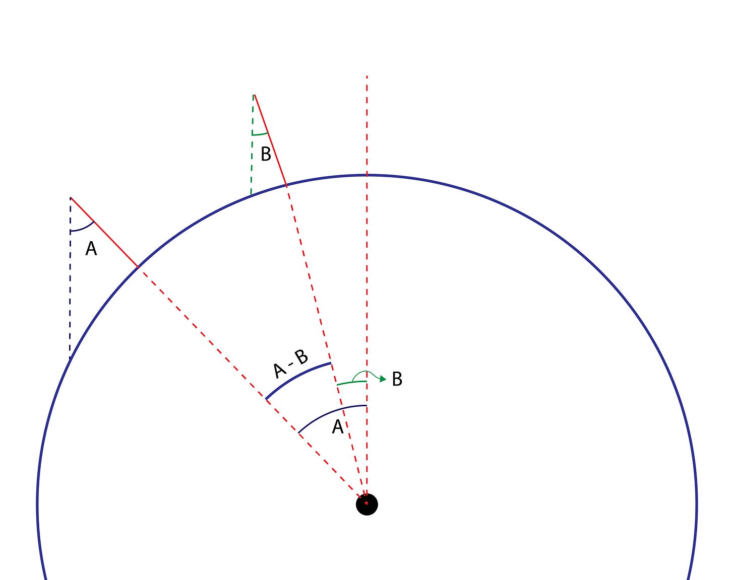 To use the same method, we don’t need to wait for summer solstice to get the perfect vertical Sun position. We can subtract the angles made by shadows at two different places to get the angle subtended at the center.