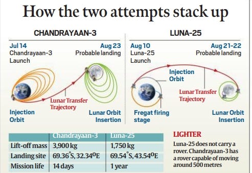 Weighing lighter than Chandrayaan-3, Luna-25 is designed to study soil composition, dust particles, and surface water detection.