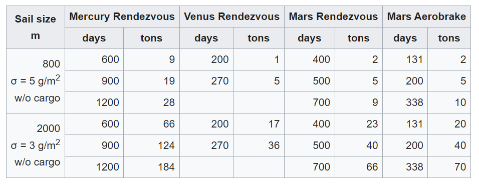 Solar sails can travel to and from all of the inner planets. They can deliver payloads and then return to Earth for subsequent voyages, operating as an interplanetary shuttle. Check the below table to get rough idea on the time that is estimated for carrying different amount of payloads and the sail size.