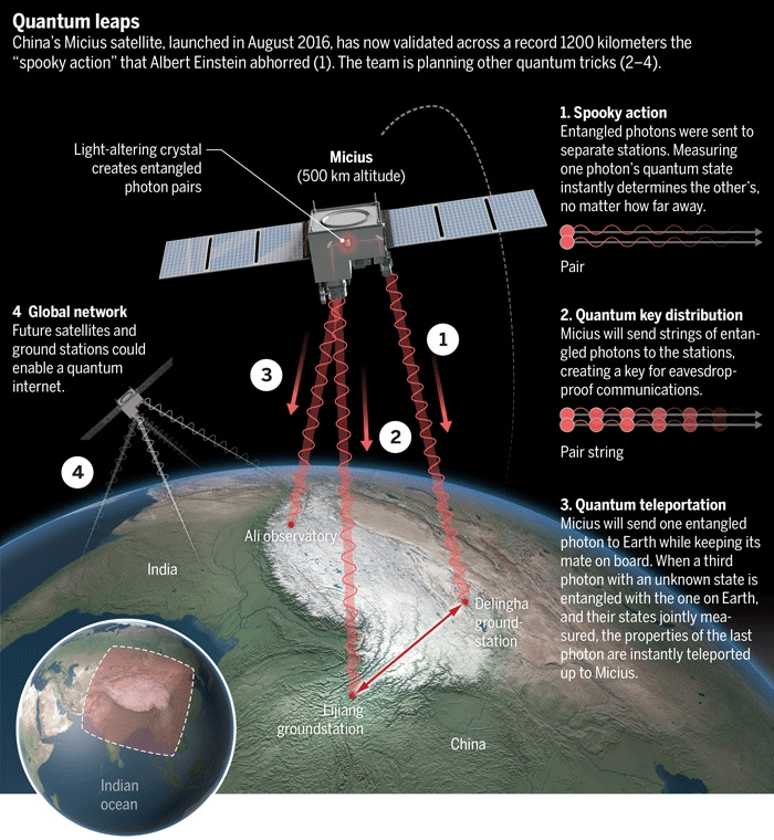 The launch of the Chinese satellite Micius in 2016 could have been viewed as merely a single addition to the 2,700-odd instruments already orbiting Earth. But it is the world’s first quantum communications satellite. Micius has successfully brought entanglement-based quantum cryptography to its original ground stations 1,200 km apart by sending simultaneous streams of entangled photons to the ground stations to establish a direct link between the two of them.