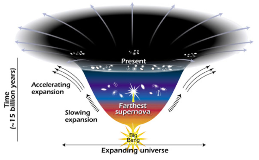 Observations show that the expansion of the universe is accelerating, such that the velocity at which a distant galaxy recedes from the observer is continuously increasing with time. While the universe has been expanding since Big Bang, the accelerated expansion of the universe is thought to have begun since the universe entered its dark-energy-dominated era roughly 5 billion years ago.